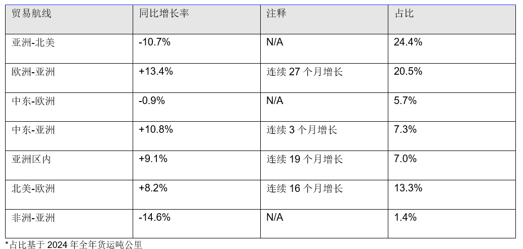 贸易航线增长:随着前期装载(在关税政策生效前将货物运往市场)的影响减弱,以及针对小包裹(特别是电商相关)最低免税额政策的调整正式实施,亚洲-北美贸易通道需求大幅减少。随着货流格局的重组,多个航线区域的需求出现增长令人惊喜。